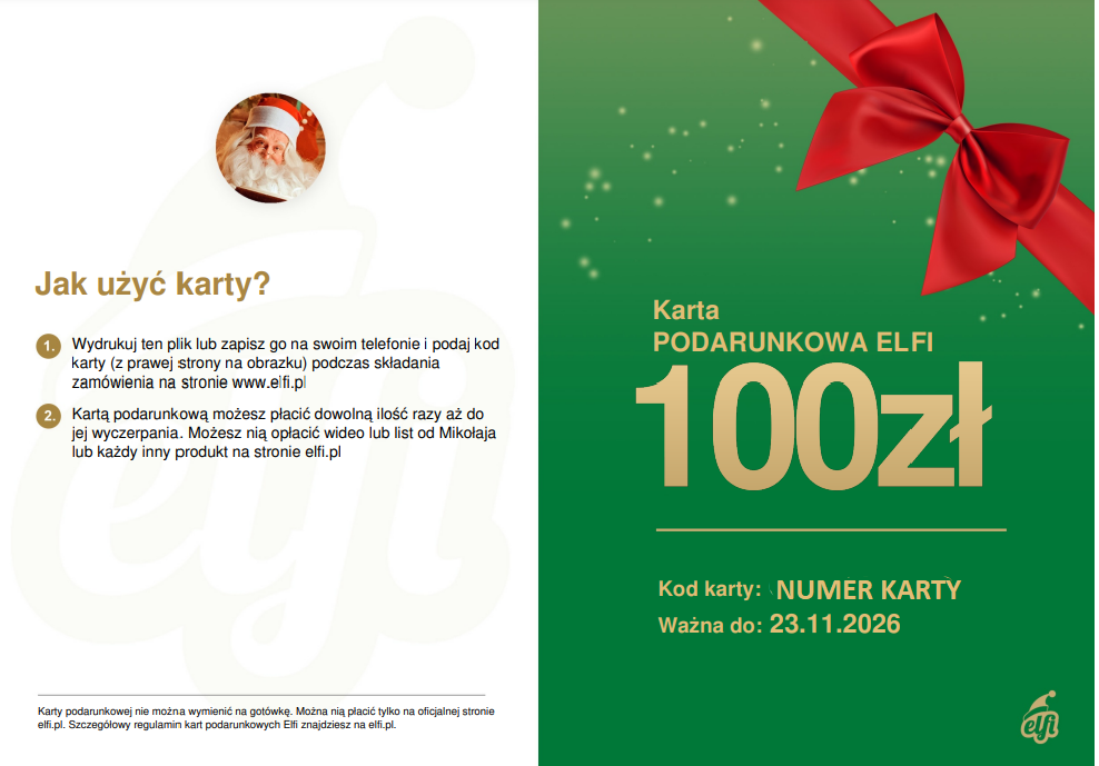 - Karta podarunkowa jest środkiem płatniczym w sklepie Elfi, a nie samodzielnym produktem. Służy wyłącznie do opłacania zakupów na stronie www.elfi.pl zgodnie z zasadami opisanymi w regulaminie.