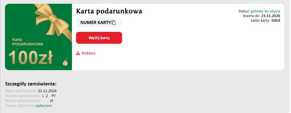 - Karty podarunkowe nie łączą się. Nie można opłacić jednego zamówienia kilkoma kartami podarunkowymi (np. dwiema lub trzema).